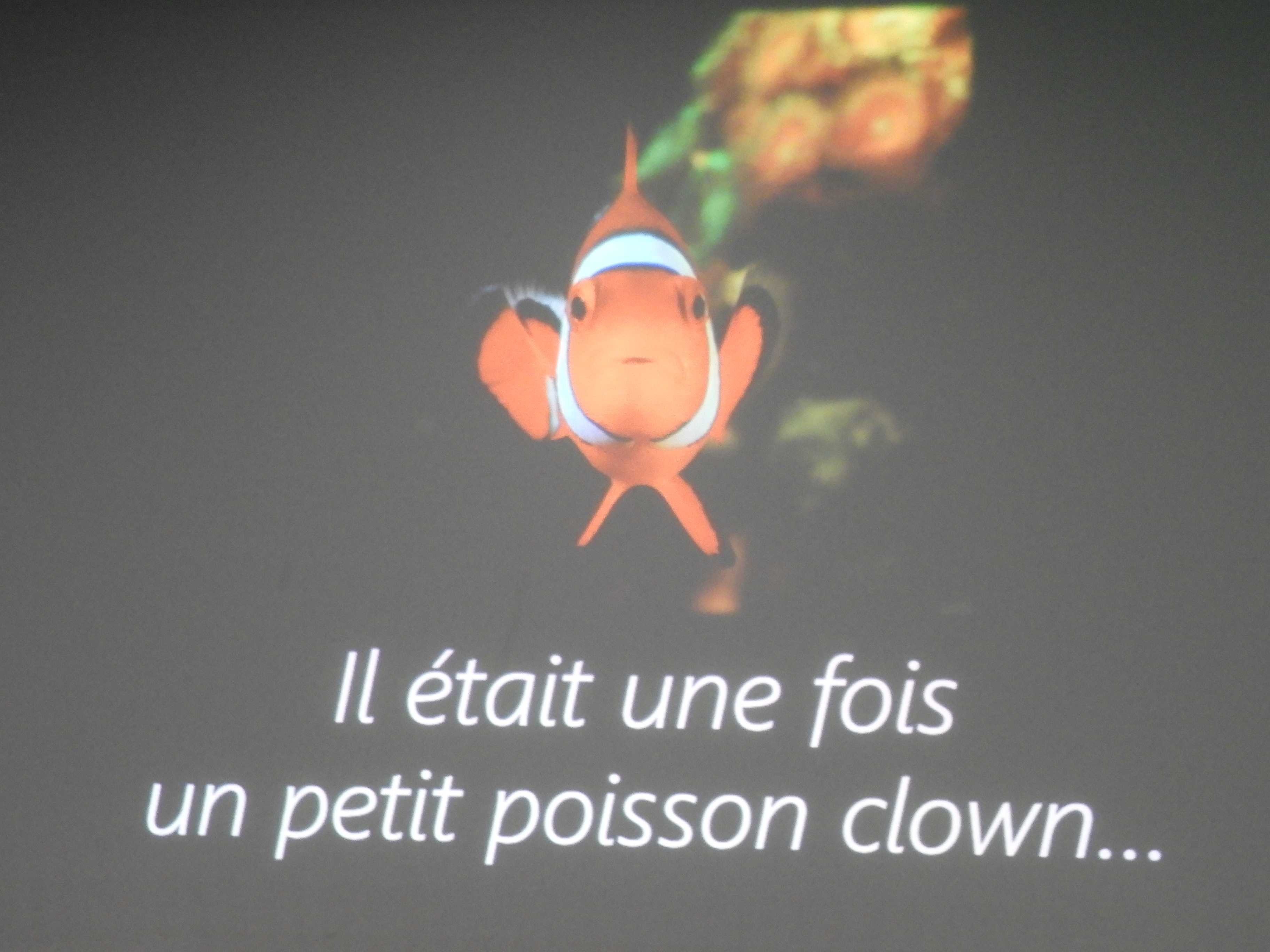 Une animatrice nous accueille et nous raconte l'"Histoire du petit poisson clown" en langue des signes.